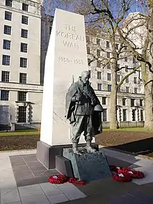 A memorial to the British soldiers in the Korean War was unveiled in Victoria Embankment Gardens, between the River Thames and the Ministry of Defence headquarters in London, England, on 3 December 2014.[1] The memorial, a bronze statue of a British soldier by the sculptor Philip Jackson, with a Portland stone obelisk on a Welsh slate base, was a gift from the Government of South Korea and was unveiled in a ceremony led by Prince Richard, Duke of Gloucester.[2]