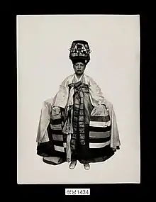 The costumes worn for these rituals are called sinbok.[308] These colorful outfits resemble those documented from the 19th and early 20th centuries,[309] and may involve a hanbok.[297] The mansin may distinguish themselves from their assistants by having their hair in the Tchokchin mŏri style.[267] For the kut, the mudang will dress in the gods' costume,[131] with different deities associated with different items of clothing.[308] They may change outfit over the course of the kut to reflect the different entities possessing them.[310] This is not a practice that the sesup mu engage in.[180]