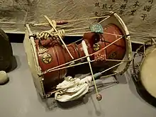 The ritual begins with the mudang inviting supernatural entities to the altar, after which they set out to entertain them.[295] Music will often be involved in the kut.[268] Musical instruments typically involved in kut include cymbals, hourglass-shaped drums called changgu, and a gong.[296] Also sometimes featured is a pipe, the p'iri.[297] The kut will often begin with drumming.[261] The mudang will often dance to the beat of the drums, often swirling in circles, something believed to facilitate the possession trance.[298] They may hold short sticks to which white paper streamers are attached; this device is intended to help channel the spirits into the mudang's body.[280]