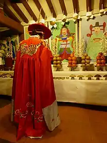 Also present will typically be candlesticks, offering bowls, and incense pots.[201] The home altar will often be dominated with bright, primary colors, in contrast to the muted earth tones which traditionally predominated in Korean daily life.[93] The mudang's altar will also often be a place to store or display their ritual paraphernalia, such as costumes.[218] It may also include toys or dolls to amuse the child gods.[219]