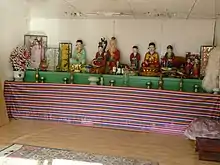 Also present may be sinsang, or deity statues made of wood, plastic, clay, straw, or metal.[216] Deities may instead be represented by a white piece of paper, the kŭlbal or kŭlmun, onto which the entity's name is written in black or red ink.[48] In musok, the deity may also be seated in physical objects, including stones, clothing, coins, dolls, or knives,[48] and which may be concealed from view, for instance being wrapped within cloth or inside a chest.[71] Some mudang also include images of Buddhist deities on their shrines.[217]