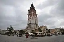 The historic Town Hall of Kraków, known as Ratusz in Polish, was demolished in 1820. It was constructed of brick and mortar for the first time in 1316 as one of its subsequent several versions built over the following centuries.[1] It was the city's administrative hub and seat of the great council, magistrate, and mayor from the 14th until the early 19th century. It was located in the centre of Main Square in the Kraków Old Town. It used to be one of Poland's oldest seats of civic government. Of the building, only the Town Hall Tower remains, serving as prominent example of the Polish Gothic architecture in the city.[1]