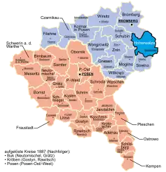 Kreis Hohensalza, known as Kreis Inowrazlaw until 1904, was a Kreis (district) in the northern administrative region of Bromberg, in the Prussian province of Posen. It was located within the Bromberg Government Region, first in the Grand Duchy of Posen (1815-1848, in personal union with Prussia) and then in the Prussian Province of Posen (1848-1919). On January 18, 1871, the Kreis, along with all of Prussia, became part of Germany. Kreis Hohensalza was part of the military command (German: Bezirkskommando) at Hohensalza (Inowrocław). The main regional court (German: Landgericht) was in Bromberg (Bydgoszcz), with a magistrate's court (German: Amtsgericht) in the capital city Hohensalza (Inowrocław).[1]