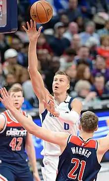 Porziņģis debuted for the Mavericks on 23 October 2019, posting 23 points and four rebounds in a 108–100 win over the Washington Wizards.[63] On 31 January 2020, he scored a then season-high 35 points, along with 12 rebounds in a 128–121 loss to the Houston Rockets.[64] On 3 February, that season-high was surpassed with a 38-point, 12-rebound performance in a 112–103 win over the Indiana Pacers.[65] Just two days later, Porziņģis followed that up with 32 points and 12 rebounds in a 121–107 loss to the Memphis Grizzlies, before leaving the game with a broken nose.[66][67] On 1 March, Porziņģis matched his then season-high 38 points, along with 14 rebounds and 5 blocks, in a 111–91 victory over the Minnesota Timberwolves.[68] Three days later, he registered 34 points, 12 rebounds and 5 blocks in a 127–123 overtime win over the New Orleans Pelicans, becoming the first player since Shaquille O'Neal in 2000 to have consecutive 30-point, 5-block games.[69][70] On 2 March 2020, Porziņģis was named the Western Conference player of the week, his second time to earn player of the week honors. From 25 February to 1 March Porziņģis averaged 26.3 points per game, 11.8 rebounds per game and 2.3 blocks per game. The Mavericks won three games and lost once.[71] On 31 July, Porziņģis recorded a season-high 39 points, as well as 16 rebounds, in a 153–149 overtime loss to the Houston Rockets. This was the Mavericks' first game in the Orlando bubble, returning from a four-month hiatus due to the COVID-19 pandemic.[72] Porziņģis finished his bubble play strong, averaging 30.5 points, 9.5 rebounds, 2.2 assists and 1.5 blocks per game across six games, earning him All Seeding Games Second Team honors.[73]