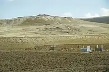 Two Hittite town consisted of an upper and lower city. The upper city had a town wall with towers and several gates.[1] Only small parts of the living quarters were excavated. The houses had irregular plans and were separated by small streets. Two larger houses were excavated in the middle of the town, not far away from the main temple. Typical for these houses is a central hall with many smaller rooms around it. In one of the houses (house A) were found 45 cuneiform clay tablets with ritual texts. It seems possible that house A was the house of a priest.[2] The main deity of Sarissa was the Weather-God; he is named in the treaty between Hattusili III and Rameses II. The temple of the god is the largest Hittite temple so far excavated. It is built of stones with a huge courtyard in the middle, about 76 by 74 m large.[3] a second temple was in the north of the city. It has again a larger courtyard and is about 54 by 36 m big. It was perhaps the temple of the goddess Anzili, who is mentioned in the texts of the town. Within this temple were also found seal impressions of a so far unknown king.[4] About 5 km south of the town was lake. Next to it were found the building of a temple. In Hettite texts is mentioned that the king came to the town and went directly to the Huwasistone of the Weather god. The excavators wonder whether this temple and lake are actually the place of the Huwasistone, where certain rituals were performed.[5]