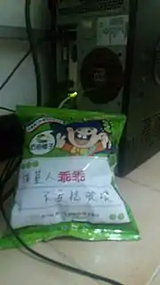 A bag of Kuai Kuai next to a desktop PC, believed by some Taiwanese to bless the machine. The package design has a space for writing wishes. The one pictured has been written with "Wikipedians behave. Do not sabotage." (維基人乖乖/不要搞破壞)