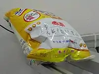 The practice of adorning machines with the snack was documented as early as 2008.[2] Adornment is not only an informal convention of the information industry in Taiwan, but also expands to other fields of industries.[3] Kuai Kuai is now placed next to the devices of server rooms, ATMs,[4][5][6][7] ticket booths,[8] control systems,[9] and toll booths.[10] It was also seen in places such as a computer center,[11] a social affairs bureau,[12] an architecture of sustainability,[13] a police station,[14] a hospital,[15] an office of nursing, a center of domestic violence and sexual assault prevention, a cutting room, a theater,[8] household registration offices,[16] and examination halls for national tests.[17] It is also among the only items of food that one can bring into otherwise-fragile computer and server rooms.[11][18][3]