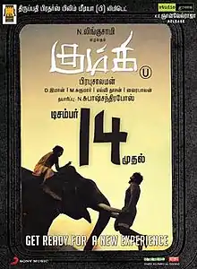 The film's distribution rights were acquired by K. E. Gnanavel Raja, under his banner Studio Green.[24] The film was initially scheduled to release on 13 November 2012, coinciding with Diwali, but due to post-production works and also due to the release of Vijay-starrer Thuppakki and Silambarasan-starrer Podaa Podi,[25] the release was postponed to 14 December 2012.[26] Kumki along with Gautham Vasudev Menon's Neethaane En Ponvasantham, were scheduled to release on the same day.[27] Both becoming the most anticipated films of the year, because of the success of the soundtrack. On 1 December, the makers confirmed the release date on the said before date.[28][29] Two days before the release of Kumki along with Neethaane En Ponvasantham, the advanced bookings for the first weekend were sold out.[30] The film was dubbed in Telugu as Gajaraju, and was released simultaneously on the same date.[31] Post-release, the makers has shot three climax scenes and planned to change the tragic climax with an alternate positive climax of the film, as the audiences were not happy over the film's ending.[32] However, the climax of the film remained unchanged.[33]