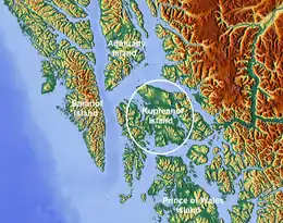 Kupreanof Island (Russian: Остров Купреянова) is an island in the Alexander Archipelago in southeastern Alaska. The island is 84 km (52 mi) long and 32 km (20 mi) wide with a total land area is 2,802.84 km2 (1,082.18 sq mi), making it the 13th largest island in the United States and the 170th largest island in the world. The Lindenberg Peninsula on the southeast side of the island is considered part of the island. The peninsula is separated from the rest of the island by a narrow inlet called Duncan Canal. The island's population was 785 at the 2000 census.