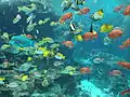 Whale sharks and manta rays are kept alongside many other fish species in the main tank.[3] Since 2015, the aquarium has also had a reef manta ray with a black body.[16] Since 2018 they also keep giant oceanic manta ray.[17] The world's first birth of a manta ray in captivity was at the aquarium in 2007. This species and the giant oceanic manta ray were only recognized as separate species in 2009; they were both classified as Manta birostris until then.[18][19][20] By the time the mother died in 2013, seven puppies were born and four survived.[21][22][23][24] There is a record that the male reef manta ray, which lived in captivity in 1992, lived for about 23 years.[25]