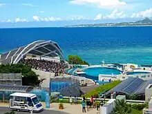 Near the aquarium is the Dolphin Show Stadium, called the Okichan Theater, where viewers can touch the animals and watch the show's performance for free.[37] There is also a dolphin contact facility called Dolphin Lagoon, which houses several species of dolphin.[38][39] The Indo-Pacific bottlenose dolphin named Okichan has been owned since the opening of the Okinawa Ocean Expo Aquarium and has been bred for 45 years as of 2020.[28]