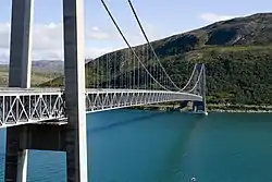 The Kvalsund Bridge (Norwegian: Kvalsundbrua) is a suspension bridge in Hammerfest Municipality, Troms og Finnmark county, Norway. The bridge crosses the Kvalsundet strait between the mainland and the island of Kvaløya. The bridge is located just west of the village of Kvalsund and about 25 kilometres (16 mi) south of the town of Hammerfest.[1]