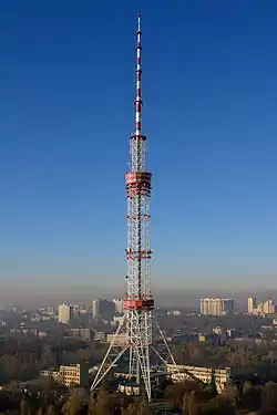 The Kyiv TV Tower (Ukrainian: Телевізійна вежа, romanized: Televiziyna vezha) is a 385 m-high (1,263 ft) lattice metal tower[1] on Oranzhereina Street, Kyiv, Ukraine, and is the tallest structure in the country.[2] The tower was built in 1973 while Kyiv was the capital of Ukrainian SSR.[3] The tower was the tallest freestanding metal structure in the world[1][2] It is used for radio and television broadcasting and is not open to the public.[1] It is the tallest lattice tower in the world and sixth tallest structure in Europe.