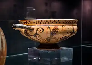 Another type is the Siana cup; this style is known for its tall feet and lips when compared to the komast cups. They are also defined with a decorated tondo and are decorated in a style reminiscent of eastern Greek traditions.[5] Their decorations can be large when compared to those of other types, often covering from foot to lip, or having layers of decoration to cover the outside of the cup. When compared to Little-Master cup, their basins are deeper and have a less defined lip.[13]
