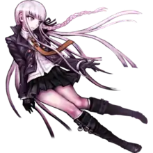 Kyoko Kirigiri is introduced in the video game Danganronpa: Trigger Happy Havoc as a mysterious woman trapped in the school Hope's Peak Academy. The main character, Makoto Naegi, is confused when meeting her as all students summoned by the academy stand out within society but he has never learned information surrounding her. As a result, Kyoko's presented title is Ultimate ??? (超高校級の「???」, Chō-kōkō-kyū no "???", lit. Super High School Level ???).[16] The entire group is told by the robot Monokuma to kill each other if they wish for freedom, resulting in a series of murders and trials to find the culprit to survive. Kyoko learns that the first victim was Makoto's childhood friend Sayaka Maizono the two become partners when trying to comfort him when learning of Sayaka's last actions. Kyoko and Makoto join forces on multiple occasions and in the class trials.[17] After exposing the suicide of Sakura Ogami, Kyoko learns there is a secret student named Mukuro Ikusaba and disappears during the investigation of her death. Kyoko's disappearance causes her to be suspected of Mukuro's eventual death. This causes the player to either expose Kyoko and kill her, ending the video game. If Makoto chooses to protect Kyoko, Makoto is instead blamed for Mukuro's death. As an artificial intelligence manages to save Makoto from Monokuma, Kyoko goes to the bottom area of the academy to save him. Kyoko apologizes to Makoto for prioritizing her investigation over him, and reveals she used to be called the "Ultimate Detective" (超高校級の「探偵」, Chō-kōkō-kyū no "Tantei", lit. Super High School Level Detective), having had more of her memories removed than the others due to how her talent would hinder Monokuma's plans. Kyoko recalls she is the daughter of Hope's Peak Academy's headmaster, Jin Kirigiri, but detests her late father. Confronting Monokuma again, Kyoko and Makoto expose the robot as the true mastermind behind Mukuro's death and the academy, Junko Enoshima.[18] Junko reveals her own identity and reveals a major tragedy that caused the amnesia within the school to protect them from the real world. Junko offers protection once again to the few survivors but Makoto convinces his classmates not to give up hope, convincing Junko to concede and allow herself to be executed, deactivating the school's air filtration system and forcing Kyoko and the survivors to leave and face the ruined world.[19]
