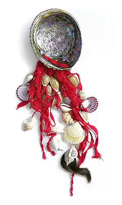 László Szlávics Jr.: Cultic proto-money, 2004, shell, textile, hair, mixed technique,
