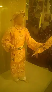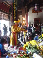 Assistants will help the medium don different costumes to match the particular gods they are incarnating; for example, if a practitioner is acting as a medium for a god who takes the form of a general, he or she may wear a general's robes, and perform a dance incorporating swords or other weapons. A medium may incarnate several gods during one session, changing his or her costume and adapting his or her movements to each. Musicians—singers and instrumentalists—accompany the practitioner, and shift from one musical style to the next depending on which god is being incarnated.[2][4] When the dance is finished, the audience is allowed to approach the still-possessed medium to make offerings, petition the deity being incarnated in exchange for favours, or to have their fortune told. The medium offers sacred gifts in return, often in the form of joss sticks.[5]