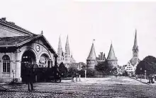 The forerunner of today's Hauptbahnhof was built by the LBE in 1851, on the wall peninsula near the Holstentor. Initially, it had only one platform, but due to later expansion work, ended up with four platforms. With increasing traffic, operations became problematic, as the trains crossed a main road directly after leaving the station, and the tracks needed to pass over several small streams. Upon the commissioning of the new Hauptbahnhof in 1908, the old station building finally lost its function.