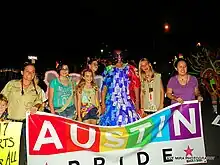 The LGBT movement in Austin began in 1970, shortly after the Stonewall riots that sparked LGBT movements across the U.S. This first public meeting was only attended by 25 individuals at University Y.[2] In 1970, Austin also became home to a chapter of the Gay Liberation Front, and local newspapers such as The Rag began supporting the movement. By 1974, the Austin Lesbian Organization and the Gay People of Austin had been established. An event organized by the Gay People of Austin was held in 1974 at Shoal Creek Park and the Student Union Ballroom, which about 300 people attended.[2] These early organizations were subjected to homophobic backlash; In 1975, an Austin Lesbian Organization party was raided by the University of Texas Silver Spurs, and pride floats built for Round Up Weekend were vandalized into the 1980s.[2] In 1976, Mayor Jeff Friedman established a Gay Pride Week to take place annually in June, which included a pride and march to the Texas State Capitol. In response to the HIV/AIDS epidemic which began in Austin in 1983,[3] the pride marches to the capitol building expanded in attendance to about 25,000 people.[2]