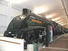 The final event in which 60008 was reunited with its five remaining A4 sisters was the 'Great Goodbye', held between 15 and 23 February 2014, at The National Railway Museum's Locomotion annex at Shildon. During this time, the National Railroad Museum was offered US$1 million by an undisclosed buyer for the engine to remain in the UK. The museum declined the offer and the engine remained on display at Shildon until mid-April 2014.[3] The engine, along with 60010 (which had been restored to its original number, 4489, as part of the exhibition plans) were covered in two layers of tarpaulins to protect and conceal them. In late April-early May, the covered engines were sent to the Port of Liverpool where they were loaded aboard the Atlantic Container Line's Atlantic Concert vessel for the voyage to Halifax. The engines were unloaded at the ports in Halifax on 11 May, where they were transferred on to flat cars to be taken by rail to their respective museums.[4] 60008 arrived at the National Railroad Museum in the Green Bay suburb of Ashwaubenon on 6 June 2014 and, on 23 June, the museum had returned the engine to the display building in which it was displayed prior to leaving for the UK.[5] The museum officially unveiled the engine as part of a new World War II themed exhibit on 2 August 2014.