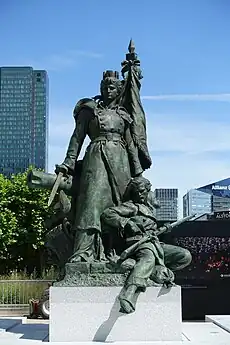 La Défense de Paris is a bronze statue by French sculptor Louis-Ernest Barrias. It commemorates the French dead from the Siege of Paris in 1870–71, during the Franco-Prussian War. The sculpture group was unveiled to the west of Paris on 12 October 1883, erected on an existing plinth that had previously supported a bronze sculpture of Napoleon by Charles Émile Seurre, alongside the crossroads between Courbevoie and Puteaux. The location became the La Défense roundabout, but the statue was later removed. The surrounding area was subsumed into Paris as the city expanded later in the 19th and in the 20th centuries; the area became known as La Défense after the statue. The statue was removed to a new location about 1965, and then moved several times before it was placed at its current location near the Arche de la Défense in 2017.