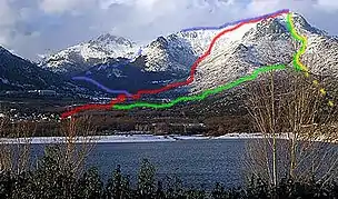 Originally, this peak was known as the "Montaña Maliciosa" (Malicious Mountain). This is due to the difficulty of its ascent, except for its northern slope. It has a fairly steep orography and there is a cumulative elevation gain of over 1100m. Later, the name was shortened and it is currently known as "La Maliciosa" or "Pico de la Maliciosa". This mountain is also known as "La Monja" because of its resemblance to a monk's headdress when covered with snow.[2] The name of this mountain dates back to the 14th century, and like the Maladeta in the Pyrenees, La Maliciosa in the Sierra de Guadarrama is the cursed one, whose rock, always desolate and naked, receives the attacks of wind, ice, water and sun.[3]