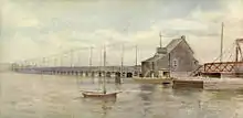 In 1826, the Cataraqui Bridge Company was formed to build a wooden bridge "1800 feet long by 25 feet wide and built on stone piers" (549 × 7.6 m).[3] The Cataraqui Bridge was opened in 1829.[3] Tolls were collected from a toll booth on the west end of the bridge, and since pedestrians were charged a penny, the bridge was popularly known as the "Penny Bridge." A drawbridge allowed larger vessels to pass through but was eventually replaced by an easier-to-operate swing bridge.