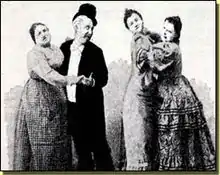 The work premiered with the cast including Emilio Mesejo (Julián), Luisa Campos (Susana), Leocadia Alba (Señá Rita), Don José Mesejo (tabernero), Manolo Rodríguez (Don Hilarión) and Irene Alba (Casta). The cast was more of actors than singers.[2] The zarzuela's great success for the authors led quickly to a debut in South America where it premiered the same year in Buenos Aires, with a cast including Rogelio Juárez (Don Hilarión), Eliseo San Juan (Julián), Clotilde Perales (Susana),[3] Carmen Ciudad (Casta), Antonia García de Videgain (Señá Rita), Salvador Videgain (Tabernero) and Isabel López (Tía Antonia). The ambassador of Spain in Argentina recalled all the artistic staff at the premieres in the capital of Buenos Aires in 1894, confirming that La Verbena premiered three months apart in three theaters, the most popular version being the first one in which that took part the Videgain family.
