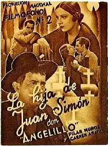 The first film, directed by José Luis Sáenz de Heredia, was released in 1935 and starred Angelillo, Pilar Muñoz and Manuel Arbó. Luis Buñuel was the executive producer for Filmófono, and had a small role as an actor.[1] One reviewer from Cine Español opined of the 1935 film, “It is essential to highlight the direction of La hija de Juan Simón as a decisive point in the creation of Spanish cinematic technique”.[2] The film was a major commercial success.[3][4] The second film was released in 1957, directed by Gonzalo Delgras, with Antonio Molina in the title role.