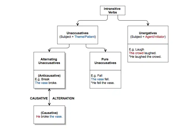 This flow chart shows that alternating unaccusatives (anticausatives) can participate in causative alternation. It is a visual representation based on information discussed in Schäfer.[3]