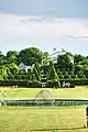 The grounds contain 15 garden rooms, each devoted to a single color, plant or theme, arranged around two cross axes with vistas. The axes meet in an oval swimming pool. The garden is particularly noted for its topiary, which was strongly influenced by Ladew's extensive travel in England, where he frequently went fox hunting. Ladew designed topiaries depicting a fox hunt with horses, riders, dogs, and fox clearing a hedge, a Chinese junk with sails, swans, and a giraffe, among others.[2] It was proclaimed an "exquisite garden estate" by The New York Times.[2] The Garden Club of America has described it as "the most outstanding topiary garden in America." The grounds also contain a 1.5-mile (2.4 km) nature walk.