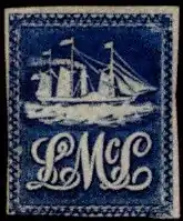 In April 1847, Bryce decided to introduce stamps that were sold individually for 5 cents, or for 4 cents if bought by the hundred. The Lady McLeod only transported letters bearing stamps, or pre-paid mail of the subscribers.[4] The imperforate stamp's illustration was a white ship on a blue background, with the initials "LMc L" printed underneath.[5] Lithographically printed,[1] the stamp was cancelled by a cross drawn by hand or by ripping up a corner.[3]