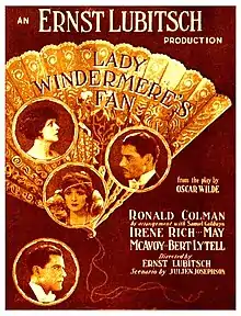 Lady Windermere's Fan is a 1925 American silent drama film directed by Ernst Lubitsch. It is based on Oscar Wilde's 1892 play Lady Windermere's Fan which was first played in America by Julia Arthur as Lady Windermere and Maurice Barrymore as Lord Darlington.[2][3] The film is being preserved by several archives.[4] It was transferred onto 16mm film by Associated Artists Productions[5] in the 1950s and shown on television. In 2002, Lady Windermere's Fan was selected for preservation in the United States National Film Registry by the Library of Congress, being deemed "culturally, historically, or aesthetically significant."[6][7]