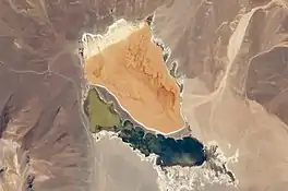 After 1,800 years before present, the lake became saltier again, either because of salt accumulation or because the lake shrank; the latter possibility is more likely. More recent fluctuations have occurred as well; a dry period may be associated with the little ice age.[34] Between 1985 and 2016, glacier coverage declined by about 32%.[35] In 2012-2015 environmental degradation in the area has become apparent, accompanied by a shrinkage of water surfaces and dropping groundwater levels.[36]