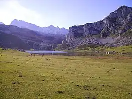 Lake Ercina is a small highland lake in Asturias, Spain. It is located in the Picos de Europa, in the Cantabrian Mountains. Situated next to Lake Enol, together, they forms the group known as Lakes of Covadonga within the Picos de Europa National Park. Lake Ercina is smaller than Lake Enol. It is situated at an altitude of 1,108 metres (3,635 ft) and its maximum depth is just over 2 metres (6 ft 7 in). The eutrophic lake covers approximately 8 hectares (20 acres).[1] Its characteristics are tied to its glacier origin and geographic location.