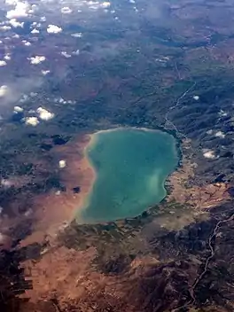 The lake is situated in the Palas neighborhood of Sarıoğlan district in Kayseri province. It is 60 km (37 mi) away from the city of Kayseri. The lake is at the center of a closed basin.[1] Its elevation is 1,054 m (3,458 ft) above mean sea level. The surface area is 25–35 km2 (9.7–13.5 sq mi). It is fed by five creeks. During the dry season, the lake basin is covered by a 10 cm (4 in) layer of salt. The lake is the site of a salt works.[2][3]