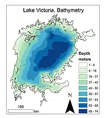 The lake is considered a shallow lake considering its large geographic area with a maximum depth of approximately 80 metres (260 ft) and an average depth of 40 metres (130 ft).[33] A 2016 project digitized ten-thousand points and created the first true bathymetric map of the lake.[32] The deepest part of the lake is offset to the east of the lake near Kenya and the lake is generally shallower in the west along the Ugandan shoreline and the south along the Tanzanian shoreline.[32]