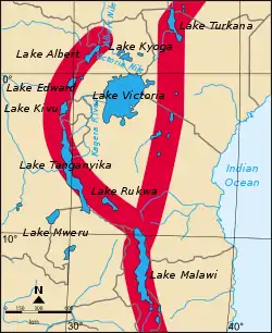 Geologically, Lake Victoria is relatively young at about 400,000 years old. It was formed when westward-flowing rivers were dammed by an upthrown crustal block.[20] During the Miocene era, what is now the catchment area of the lake was on the western side of an uplifted area that functioned as a continental divide, with streams on the western side flowing into the Congo River basin and streams on the eastern side flowing to the Indian Ocean. As the East African Rift System formed, the eastern wall of the Albertine Rift (or Western Rift) rose, gradually reversing the drainage towards what is now Lake Victoria. The opening of the main East African Rift and the Albertine Rift down warped the area between them as the rift walls rose, creating the current Lake Victoria basin.[21]