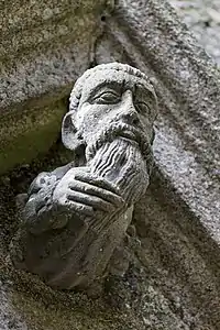 This building dates to 1667 and is attributed to G. Kerlezroux. The motto "Memento mori" is written above the ossuary door, contrasting with the fine carving of the Tree of life on the door itself; the sculptor juxtaposed images of life and death. Inside the ossuary there is an altarpiece depicting the resurrection with a depiction of the "Risen Lord" with Saint Sebastian to the left and Saint Roch on the right. Also to the left of the altarpiece are statues of Saint Anne and the Virgin Mary and on the right a statue of Saint Pol and the dragon. The "Mise au Tombeau" or Burial of Jesus, shown in the photographs which appear later, was originally in the ossuary, but was subsequently moved to the church. Above the door there is also a sculpture of a man's head: he gingerly strokes his beard. Thus in its overall imagery, the ossuary deals not just with death but life and resurrection.[5]
