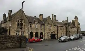 The main building constructed in 1846 by William Tite was situated on the west side of the line in Tudor Revival style using roughly squared sandstone rubble. This two-storey building was extended southwards in 1852 in similar style although this section terminated in a tower of three storeys. A new entrance was constructed in 1900 on the eastern side of the line at footbridge level; this is nearer the town and houses the remaining ticket office.[3]