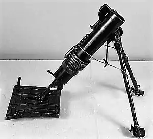 After testing in 1937 an initial order for 21,950 mortars was placed in January 1938. This order was later changed to 50,000 mortars at the outbreak of war with all mortars to be completed by January 1941.[3] However, only 2,900 had been produced by June 1940 and few had been put into service due to a shortage of ammunition. Production ceased after the French surrender in 1940 and wasn't resumed until 1944.[4] Those mortars captured by the Germans were given the designation Granatwerfer 203(f)[1] and issued to occupation troops. The modèle 37 remained in the French inventory until the end of the First Indochina War when it was retired.[4]