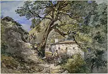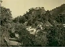 Landour, a small cantonment town contiguous with Mussoorie, is about 35 km (22 mi) from the city of Dehradun in the northern state of Uttarakhand in India.[2] The twin towns of Mussoorie and Landour, together, are a well-known British Raj-era hill station in northern India. Mussoorie-Landour was widely known as the "Queen of the Hills". The name Landour is drawn from Llanddowror, a village in Carmarthenshire in southwest Wales.[3] During the Raj, it was common to give nostalgic English, Scottish, Welsh or Irish names to one's home (or even to British-founded towns), reflecting one's ethnicity. Names drawn from literary works were also common, as from those by Robert Burns, Sir Walter Scott, Thomas Hardy, Robert Louis Stevenson and many others.[4]