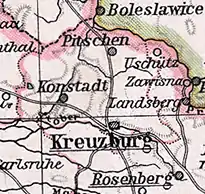 In the course of the Stein-Hardenberg Reforms, the district of Kreuzburg in the Province of Silesia was initially assigned to Regierungsbezirk Breslau, but then on May 1, 1820, it was reclassified to Regierungsbezirk Oppeln. Since then, the district has been considered part of Upper Silesia.[1] The district capital was changed to Konstadt (Wołczyn), but was moved back to Kreuzburg on January 1, 1880. The spelling of the name of the city and the district fluctuated between Creutzburg, Creuzburg and Kreuzburg. The city and district name was officially set to Kreuzburg in Oberschlesien on September 23, 1881. Later, the abbreviation Kreuzburg OS was adopted.