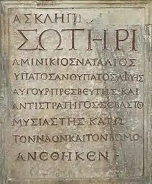 Greek dedication on an altar to Asclepius the Savior by the Roman consul Lucius Minucius Natalis (133–134 AD)[25]