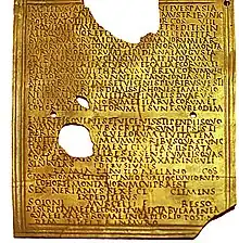 Punic, the Semitic language of the Carthaginians, continued to be used in North Africa during the Imperial period.[72] Before the Roman conquest in 146 BC, nearly all Punic inscriptions had been votive to the deities Tanit and Ba'al or funerary commemorations, but during the Roman era a broader range of content is found in Neo-Punic, often appearing with parallel texts in Latin or Greek.[73] A striking occurrence of Neo-Punic is found at the otherwise thoroughly Roman temple of Roma and Augustus, built 14–19 AD at Leptis Magna.[74] One of the latest Neo-Punic inscriptions on a monument dates to the reign of Domitian (81–96 AD).[75] No inscription in Punic script on stone can be dated later than the 2nd or 3rd century.[76] Latin script was used to write Punic in the 4th and 5th centuries.[77]
