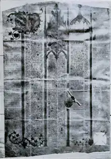 The Larmenius Charter or Carta Transmissionis ("Charter of Transmission") is a coded Latin manuscript purportedly created by Johannes Marcus Larmenius (Fr.: Jean-Marc Larmenius) in February 1324, detailing the transfer of leadership of the Knights Templar to Larmenius after the death of Jacques de Molay. It also has appended to it a list of 22 successive Grand Masters of the Knights Templar after de Molay, ending in 1804, the name of Bernard-Raymond Fabré-Palaprat appearing last on the list (who revealed the existence of the Charter in 1804). The document is written in a supposed devised ancient Knights Templar Codex.[1] Actually in Freemason custody, the document is kept at the Mark Masons Hall in London.[1] Some researchers have concluded that it is a forgery, while others assert its authenticity.[2]