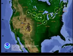 The massive system continued to trek to the east, as it began to push more into Canada, rather than the United States. An icing threat was also imminent as well. Some areas in Michigan recorded up to 0.5–0.75 inches (13–19 mm) of ice on March 24.[3] Part of Ontario were also impacted with significant freezing rain leading to significant ice accretion, the hardest hit area was that of Fergus, Ontario where there was roughly 1.4 inches (35 mm) of ice accretion. More ice accumulations were possible in New England, where freezing rain advisories were put into effect through March 25. The storm then started to rapidly weaken as it continued to move to the east, moved offshore late on March 25, then finally dissipated on March 26 while situated off Saint Pierre and Miquelon,[1] however, its remaining cold front lingered across the South while transitioning into a stationary front, which flared up thunderstorm activity for the Easter weekend.