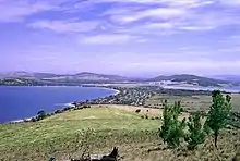 The view also shows the nearby ABC radio transmitter mast. The Ralphs Bay side of Lauderdale reveals a sharp gradient in the bay where the water changes colour. This change can be especially noticeable when driving along the main road from Hobart.
