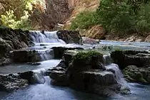 One of Crossey's areas of study is the formation of travertines and springs.[13] As water from rain or snowmelt travels through the geological structures of the Grand Canyon, calcite from the Canyon's limestone layers dissolves into it. When the water emerges at springs or is agitated, as happens at rapids and waterfalls in the Havasu Creek, the calcite precipitates out of the water and forms new travertine rock. Formation of travertine is further mediated by bacteria. Crossey has determined that travertine formation is more likely to occur when meteoric groundwater from rain or snowmelt mixes with deeper groundwater that rises from the Earth's mantle.[13]