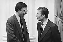 Parliamentary leaders Laurens Jan Brinkhorst and Ruud Lubbers in the House of Representatives on 9 June 1982.